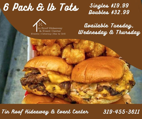Tin Roof Hideaway Bar & Grill offers a wide variety menu, from burgers, specialty sandwiches, Nachos and salads.